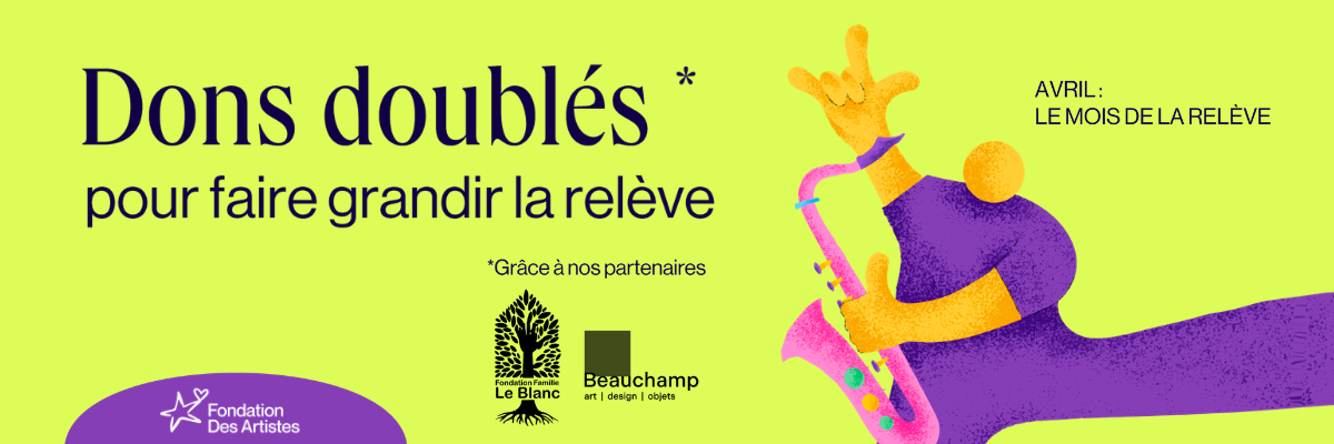 En avril, chaque don fait à la Fondation des artistes est doublé grâce au soutien de la Fondation Famille Le Blanc et les Galeries d’art Beauchamp, via leur Fonds-Fondation Famille Beauchamp. Une occasion unique de renforcer la chaîne de solidarité qui a déjà accompagné plus de 850 artistes dans la dernière année.